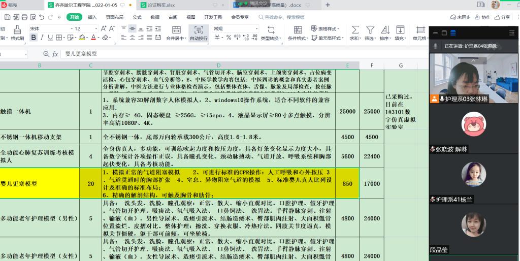 1月5日上午,在一号教学区1215教室,护理学专业组织专业教师、实训中心教师对2022年拟购买的实践教学设备进行论证,本次论证线上线下同时进行,由专业负责人张林琳、专业助理张道勇分别组织护理学、基础医学教师进行论证。