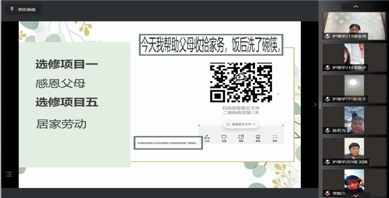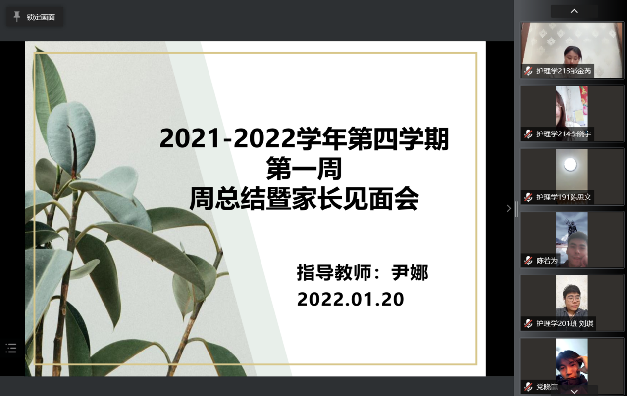 120日,健康与护理系生涯导师尹娜采用腾讯会议召开第四学期第一周周总结暨家长见面会,健康与护理系113组—120组成员及家长共同参加。