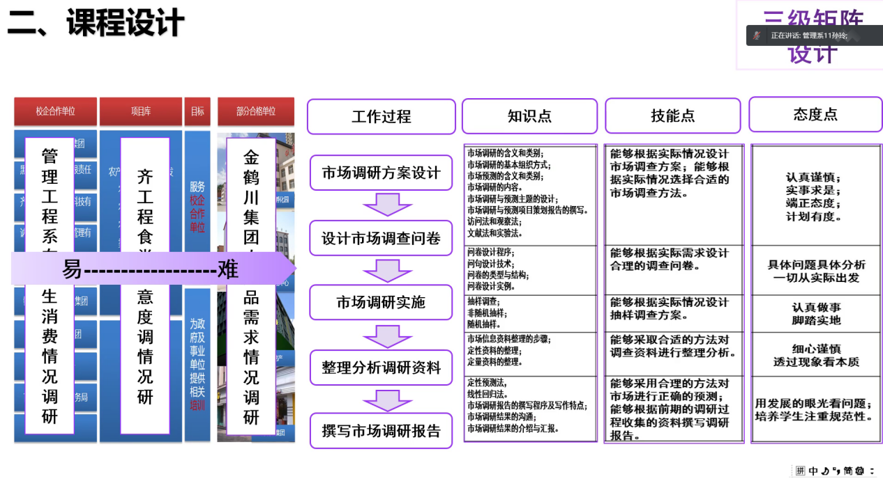 本次说课以专业为单位有序进行,各位教师分别从课程定位、课程设计、课程实施、课程评价四要素的展开进行说课,根据课程在专业中的地位,突出门课教学目标和项目教学目标的确定,阐述了门课开设的必要性、教学目标确定的科学性及设计、实施与评价的可行性。此外,教师结合专业特点,说明如何运用“四真三化”课程建设模式进行课程开发与管理,将专业教育与创新创业教育融合,挖掘知识点、技能点背后所蕴含的态度点进行课程思政设计。