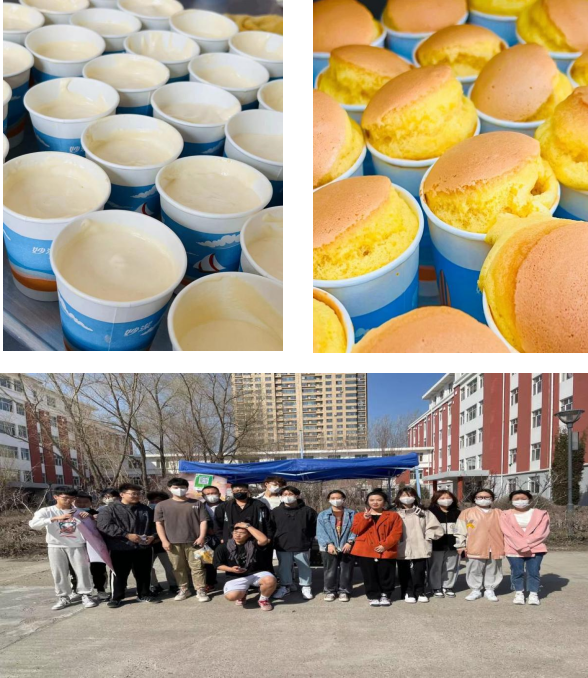 参加活动的同学九点半到场,洗手消毒摆放好食材,严格根据实训要求做准备。随后,他们分工协作,按照清洗器具、打鸡蛋、称面粉、搅奶油、挤奶油、烘烤蛋糕等程序操作,试烤第一盘蛋糕成功出炉后,外观口感俱佳,同学们信心大增,将剩余蛋糕胚放进烤箱内进行烘烤,出炉的蛋糕得到了同学们的一直认可与好评。