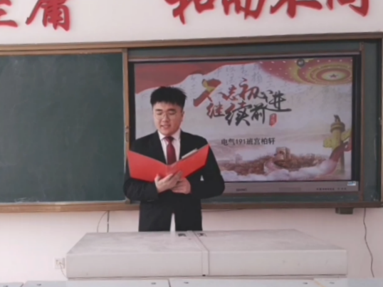 本次朗诵比赛,参赛团队借助现有条件,完成个性化的参赛作品。有的学生参赛作品以大健康教育实训教学中心的不忘初心、牢记使命宣传板和校园代表性建筑为背景墙,更多的以教室“中而至庸 和而不同”校训与PPT课件为衬托进行朗诵。