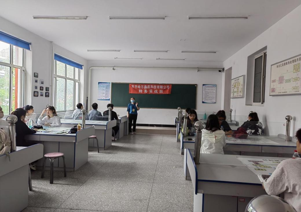 在会计手工账实训室成立齐齐哈尔鑫赢科技有限公司财务实战班,实习生为2021级的18名学生。在专业教师郑凤云的指导下,学生进行了出纳岗位整月业务处理的经济业务记账凭证登记。财务管理专业将企业的财务办公室搬到了实训室,学生在真实项目中学习、成长。