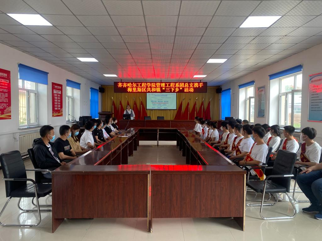 在梅里斯达斡尔族区共和镇,王丽伟首先进行了党史知识宣讲,并向镇领导介绍了学校历史以及此次“三下乡”的目的。