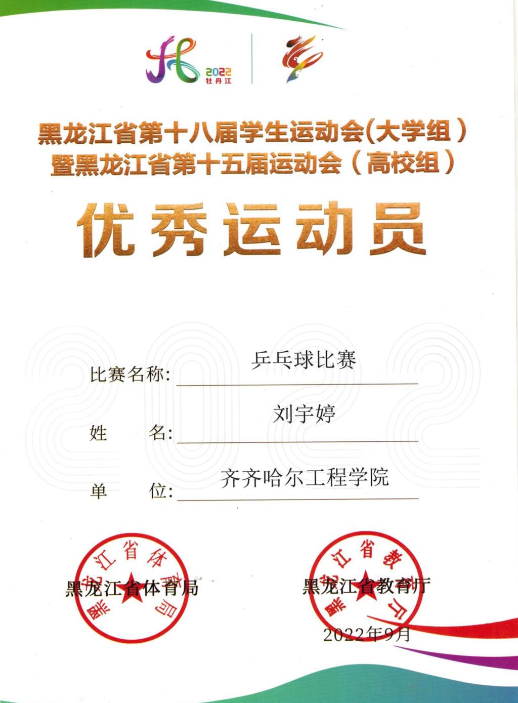 我校武术队的谢阳妮同学获得女子长拳铜牌、女子剑术第四名和女子枪术第四名的好成绩;乒乓球队的刘宇婷、武术队的刘举源同学荣获优秀运动员称号;两个项目的教练员韩淑梅和于壮老师均获优秀教练员称号。