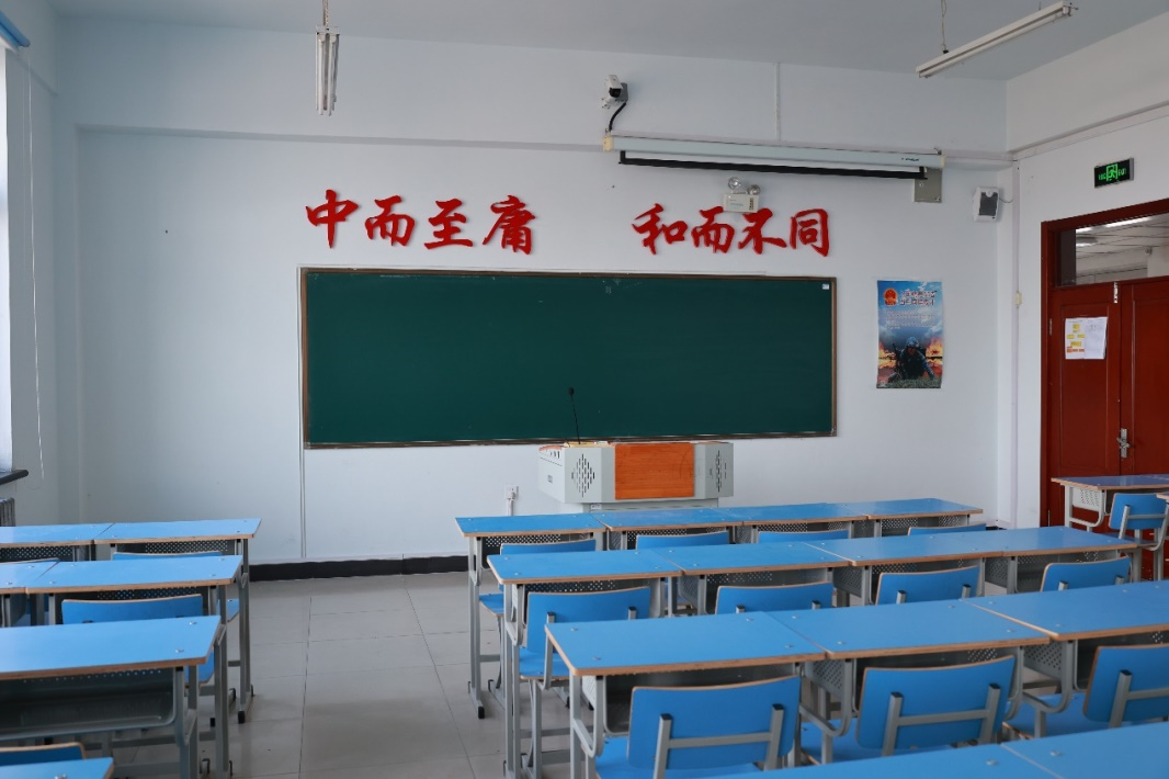 教室严阵以待,设施优化、配置齐全、桌椅规整、校训抢眼,就等你加入,只为点燃智慧,深耕应用型的发展田。