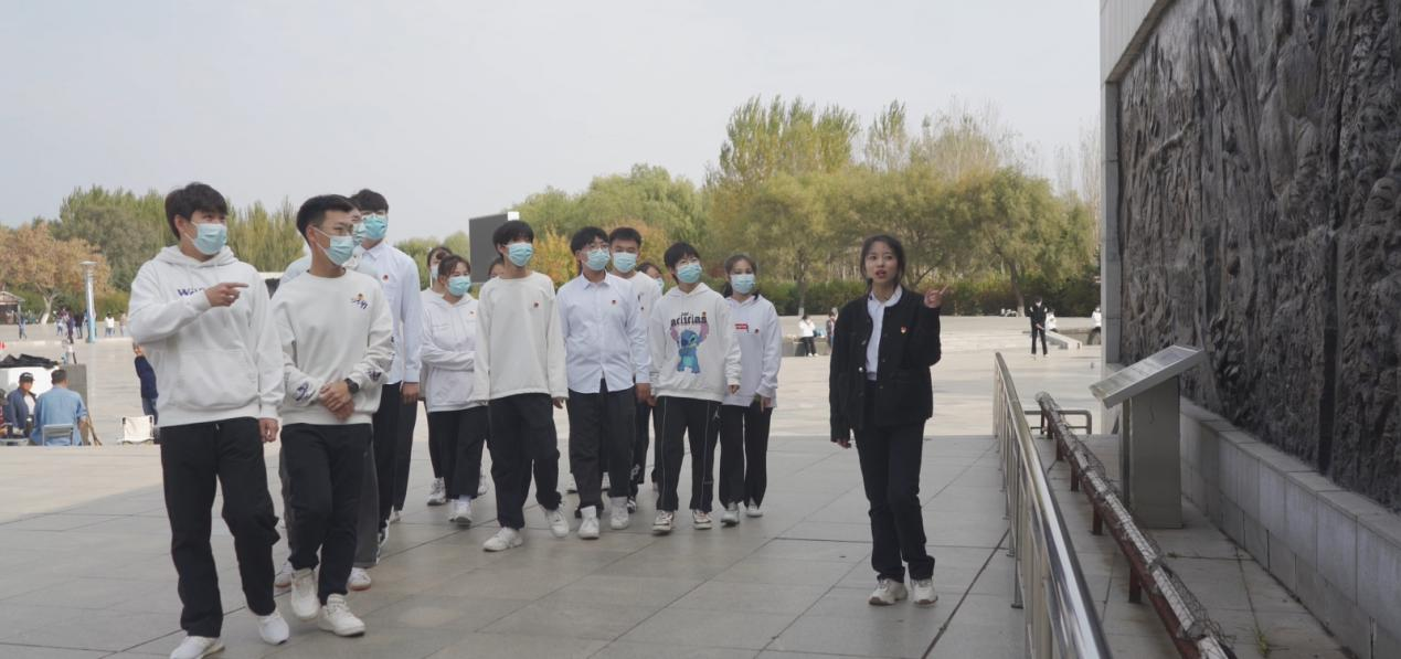 思政教学部党支部青年教师朱振楠带领学生来到和平广场,为学生讲述和平广场纪念墙上雕刻的历史故事,让学生聆听前辈的英勇故事,感受中华民族热爱和平、英勇抗战的伟大爱国主义精神。