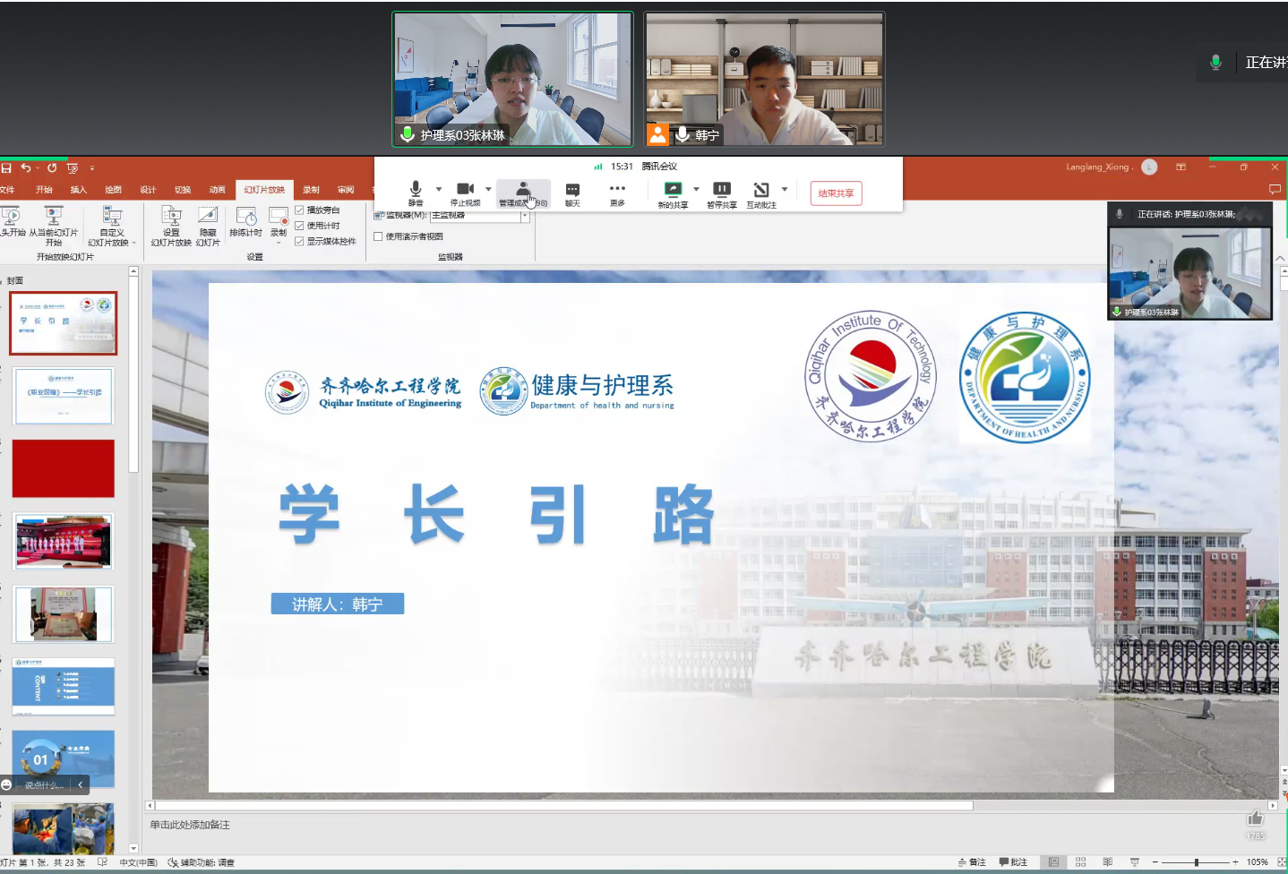 近日,护理学专业组织2022级学生进行学长引路、职业规划讲座。讲座采用腾讯会议形式,其中学长引路讲座由该专业长张林琳、护理学205班班长韩宁共同主持。