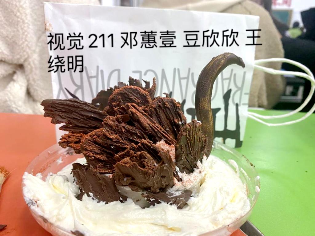 比赛以学生自行组队或个人参赛的形式,运用巧克力酱及奶油进行花样创作,可自带食材对作品进行装饰,完成作品后拍照上传至活动群中由大家进行点评,并投票选出的获奖作品进行展示。