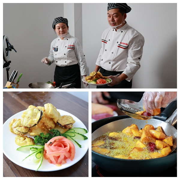 随后,授课老师讲授了拔丝地瓜、茄盒的制作方法,为提升食物美感,中间还穿插了一个用黄瓜、西红柿制作简易造型的小环节,用做摆盘;同学们课前准备了地瓜、白糖、茄子、肉馅及各种调料,课中积极跟随老师实际操作,做出了香甜的拔丝地瓜和酥脆的茄盒。