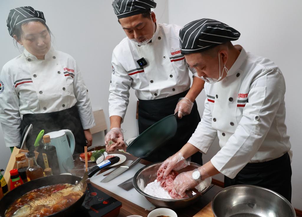 授课老师讲授了家常凉菜、红烧鲤鱼和松鼠鲤鱼的制作方法。高晓东老师按照北方口味制作红烧鲤鱼,咸鲜味美,高凯老师以南方口味制作松鼠鲤鱼,酸甜鲜美;在凉菜的制作上,也各自体现出南北方口味的差异。