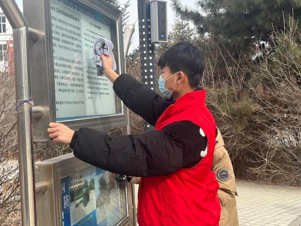 志愿者们相互配合,认真负责,充分发挥了“奉献、友爱、互助、进步”的志愿精神,展现当代大学生的责任与担当。他们的身影穿梭在教学楼、九思廊、篮球场、图书馆等地方,清扫积雪,清洁宣传展板、室外椅凳、健身器材、教室卫生,以及捡拾寝室楼周边白色垃圾等,助力文明校园建设,“擦亮校园名片”。