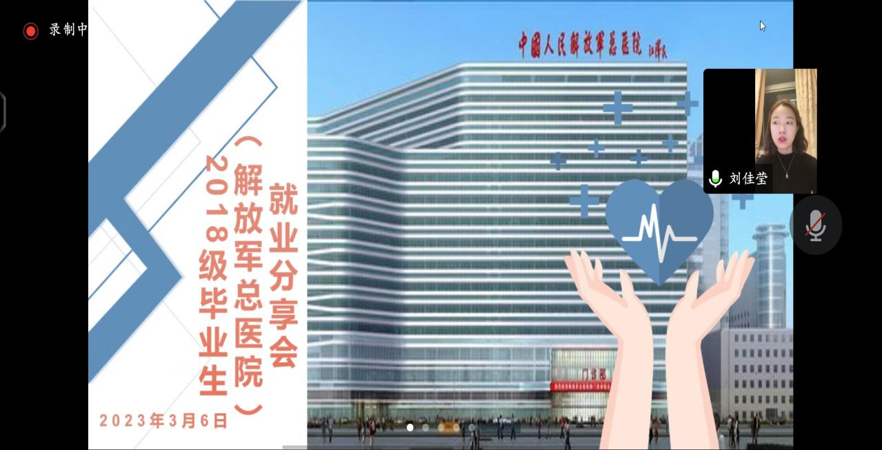 会议首先由高悦介绍2018级学姐刘佳莹及其所就职的解放军总医院第一医学中心(301医院)情况。随后,刘佳莹向大家分享了自己笔试、面试的经验,介绍了近几年医院的招聘原则,讲明在面试中最重要的是语言一定要有逻辑性,简洁且精华;医院面试提出的问题大多属于专业实践方面,她建议大家要熟悉专业技能,并介绍了薪资待遇问题。同学们积极向刘佳莹提问,刘佳莹耐心解答。