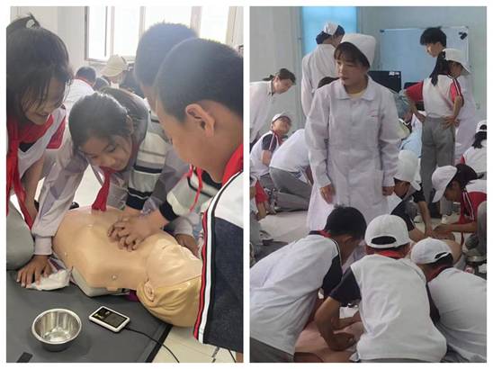 在基础生命支持实训室,孩子们跟随老师的指导,动手做心肺复苏操作,各个认真学习,用心体验。