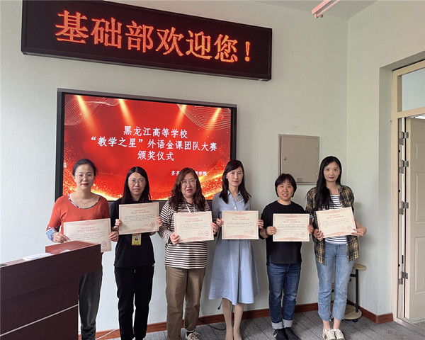 6月5日下午,基础部大外教研室在三号教学区2308会议室举行了黑龙江高等学校“教学之星”外语金课团队大赛颁奖仪式暨“外研社·国才杯”大赛颁奖仪式。我校由刘欢、曹献玲、刘双丽、孙伟和黄强五位老师组成的团队在本次大赛中协同合作、凝智聚力、互助互促,彰显团队魅力,荣获三等奖;吴若倩、裴孟颖、王芳和王雨婷四名同学代表我校参加黑龙江省赛区决赛,荣获三等奖。