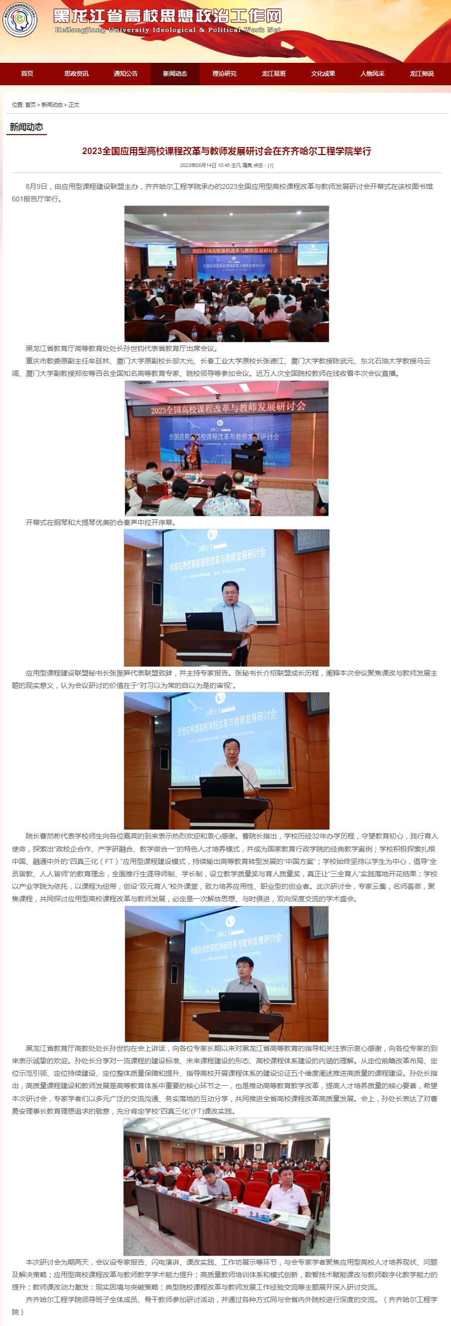 黑龙江省高校思想政治工作网:2023全国应用型高校课程改革与教师发展研讨会在乐投app官方在线入口举行