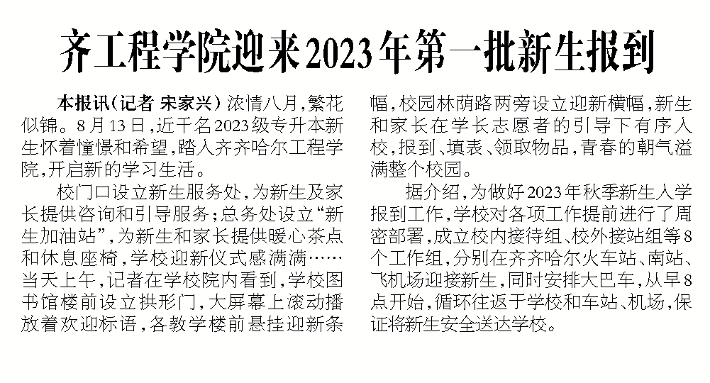齐齐哈尔日报:齐工程学院迎来2023年第一批新生报到