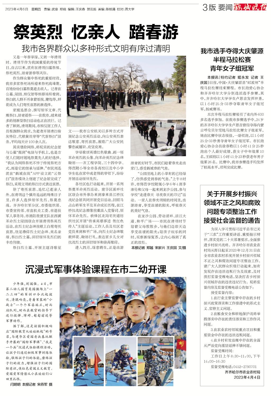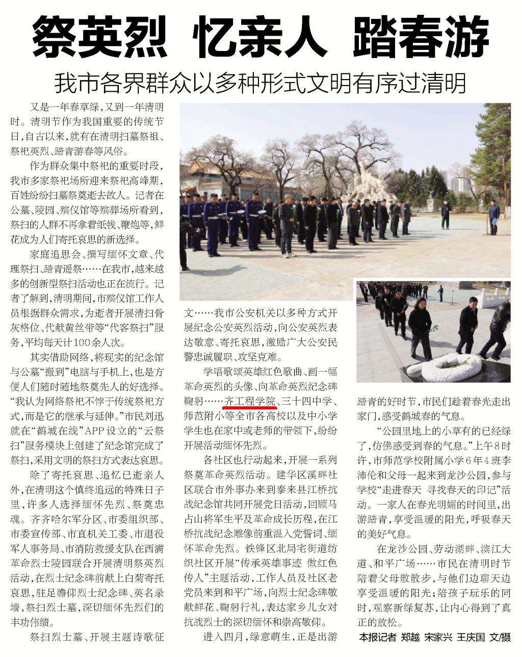 鹤城晚报清明节“祭英烈”综合报道提及我校
