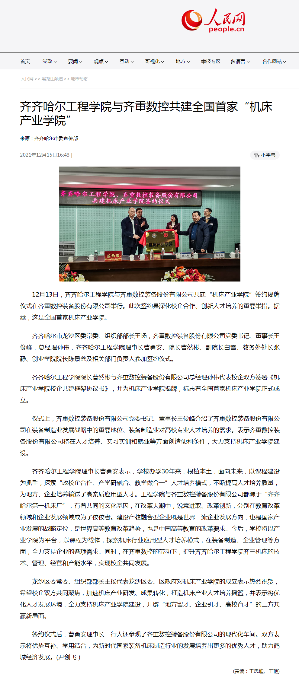 人民网:乐投app官方在线入口与齐重数控共建全国首家“机床产业学院”