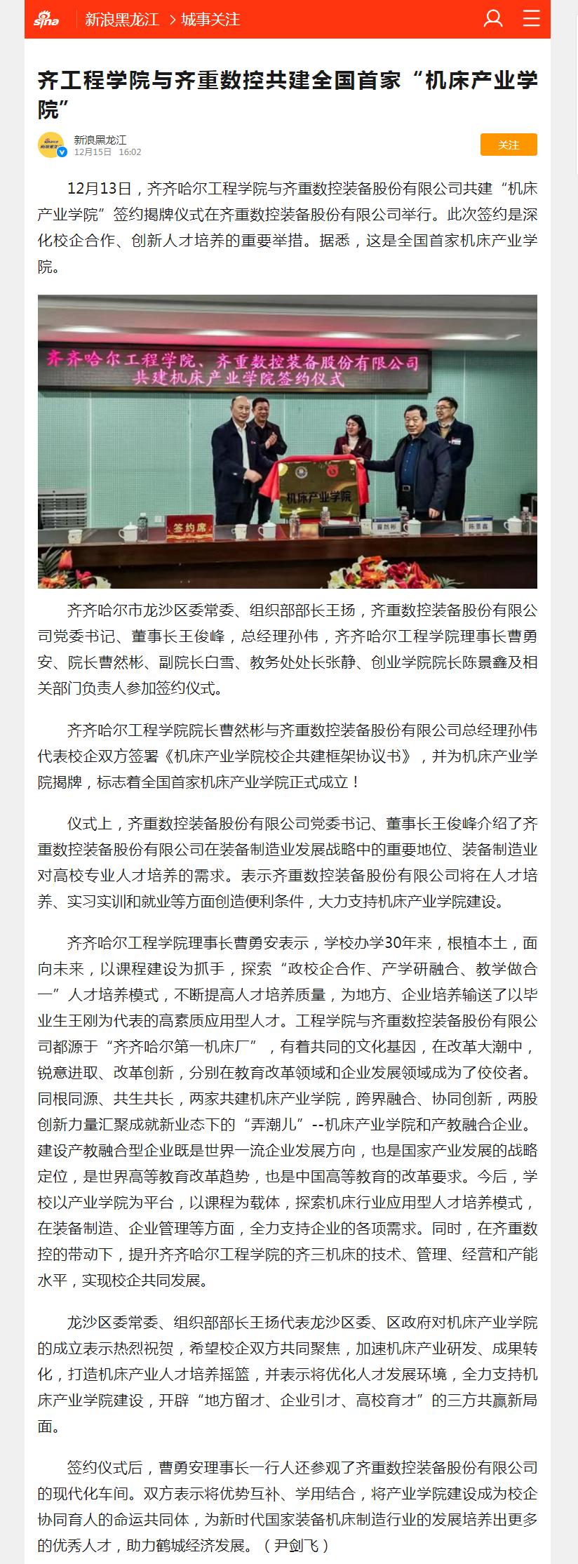 新浪黑龙江:齐工程学院与齐重数控共建全国首家“机床产业学院”