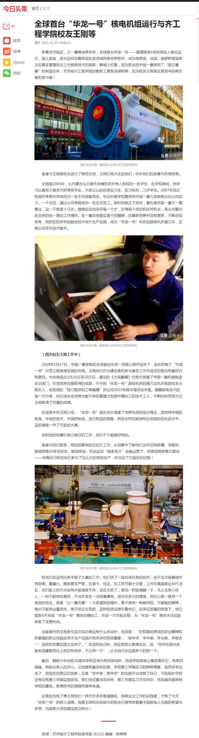 今日头条:全球首台“华龙一号”核电机组运行与齐工程学院校友王刚等