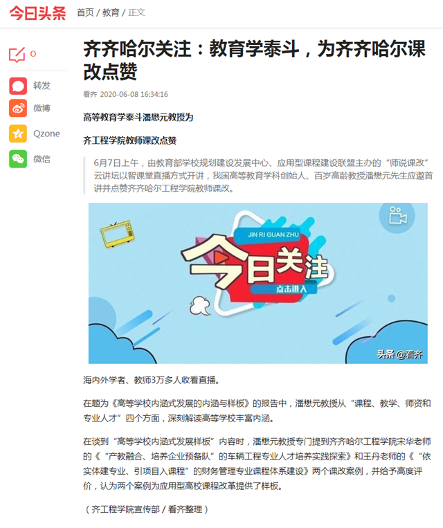 今日头条《齐齐哈尔关注》:教育学泰斗,为齐齐哈尔课改点赞