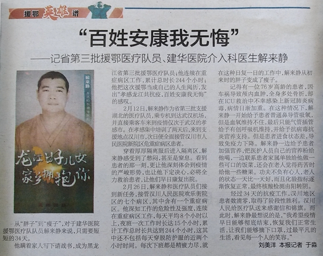 鹤城晚报报道学校附属建华医院介入科医生解来静(我省第三批援鄂医疗队员)事迹