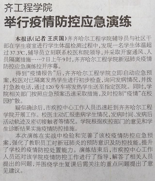 齐齐哈尔日报:齐工程学院举行疫情防控应急演练