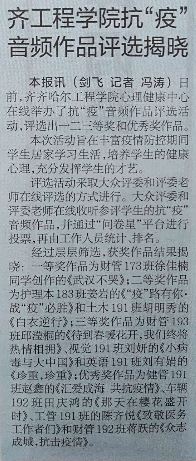 鹤城晚报:齐工程学院抗“疫”音频作品评选揭晓