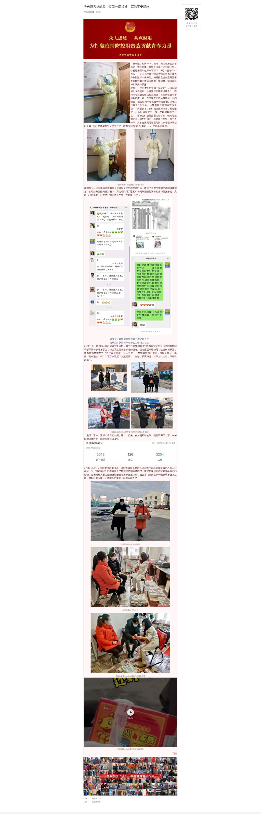 铁锋团区委报道徐梦露(学校附属建华医院护士):家里一切都好,等你平安凯旋