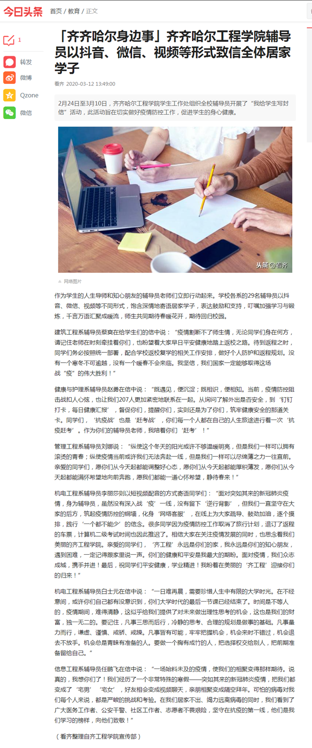 今日头条《齐齐哈尔身边事》:乐投app官方在线入口辅导员以抖音、微信、视频等形式致信全体居家学子