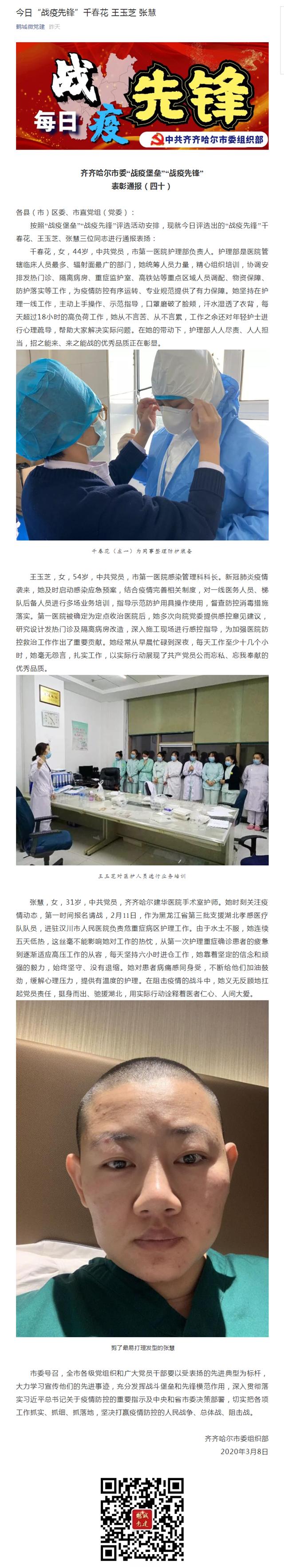 鹤城微党建:学校附属建华医院张慧获市委组织部“战疫先锋”荣誉表彰