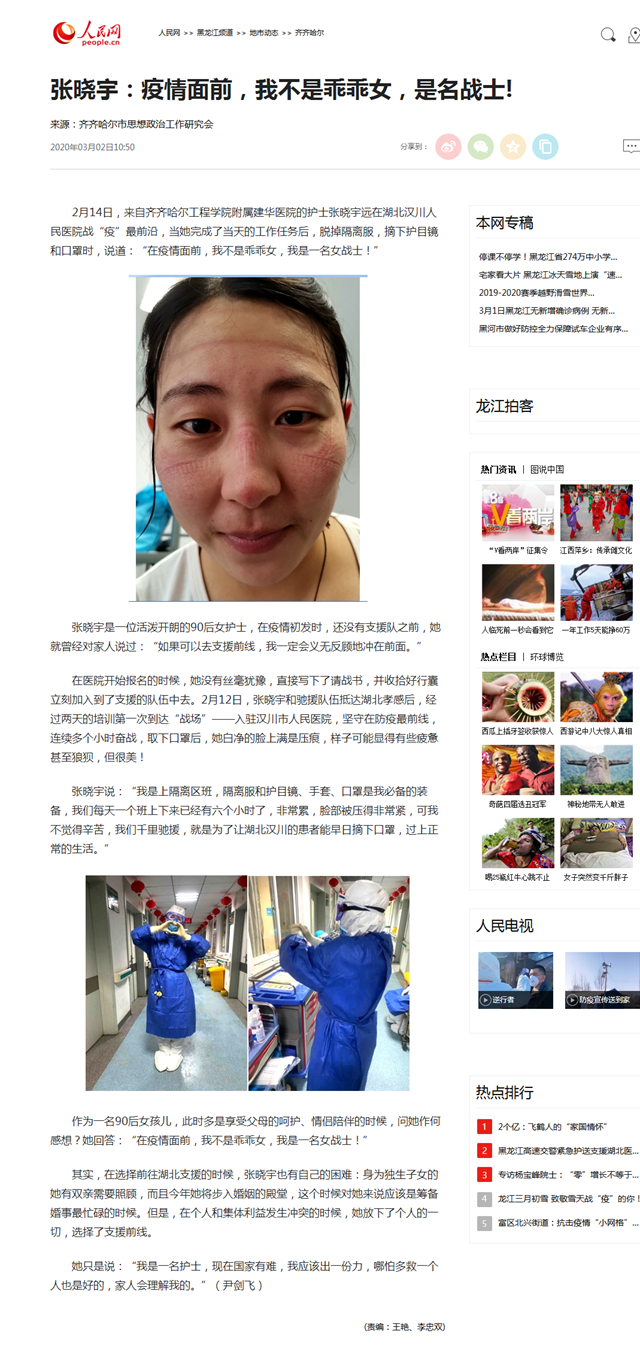 人民网:张晓宇:疫情面前,我不是乖乖女,是名战士!