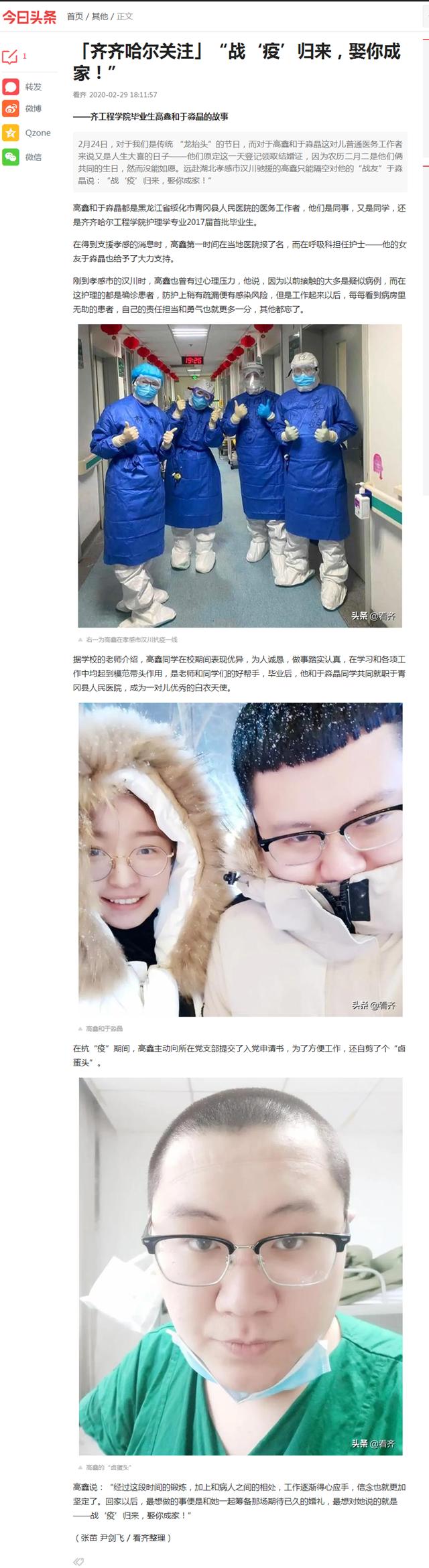 今日头条《齐齐哈尔关注》:“战‘疫’归来,娶你成家!”——齐工程学院毕业生高鑫和于淼晶的故事