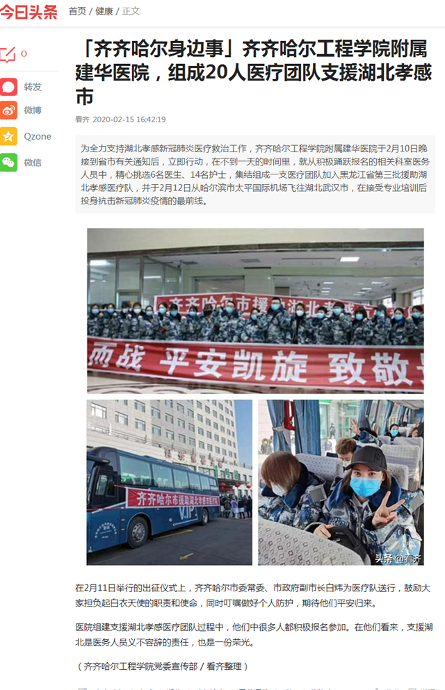 今日头条《齐齐哈尔身边事》:乐投app官方在线入口附属建华医院,组成20人医疗团队支援湖北孝感市