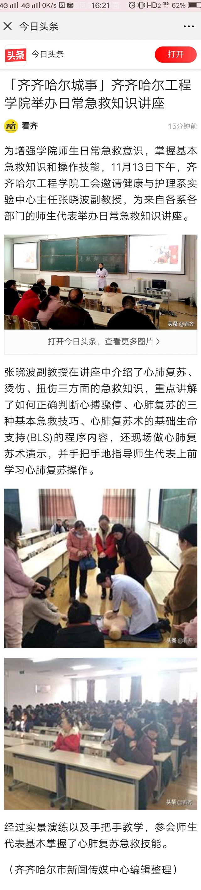 今日头条《齐齐哈尔城事》:乐投app官方在线入口举办日常急救知识讲座