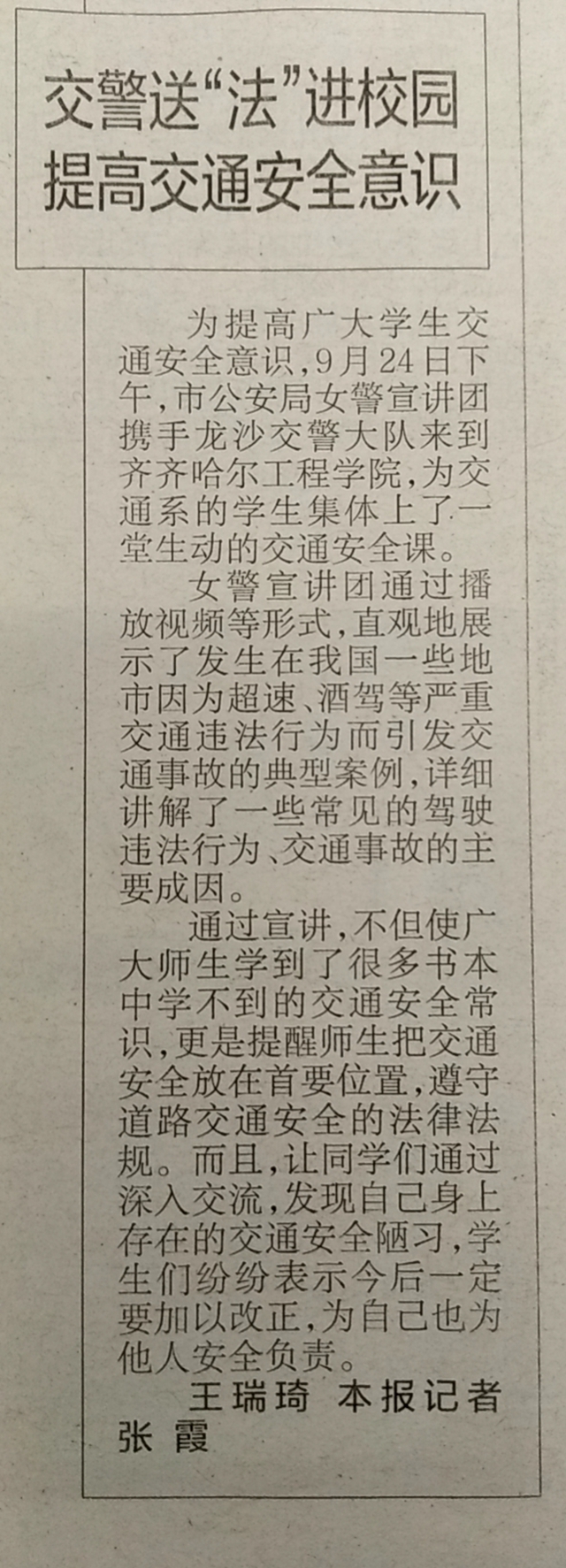 鹤城晚报:交警送“法”进校园 提高交通安全意识