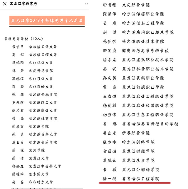 黑龙江省教育厅微信公众号报道学院教师徐一楠荣获“黑龙江省2019年师德先进个人”称号