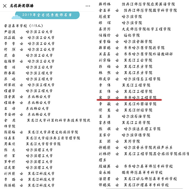龙视新闻联播微信公众号报道学院教师宋华荣获“2019年全省优秀教师”称号