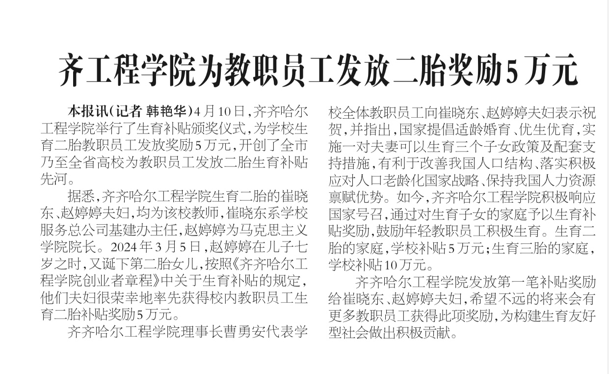 《齐齐哈尔日报》报道齐工程学院为教职员工发放二胎奖励5万元
