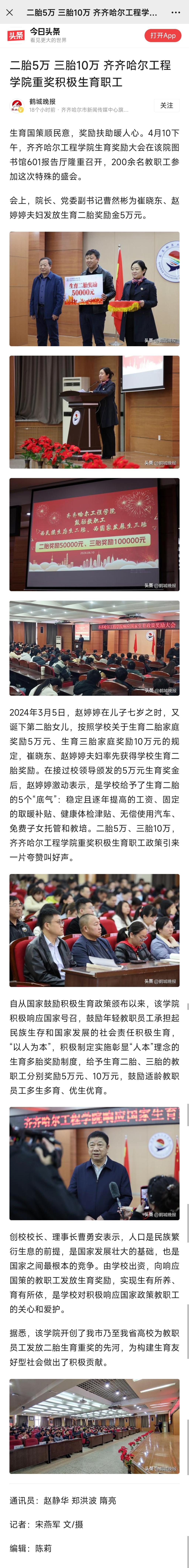 《今日头条》 (鹤城晚报)报道二胎5万 三胎10万 乐投app官方在线入口重奖积极生育职工