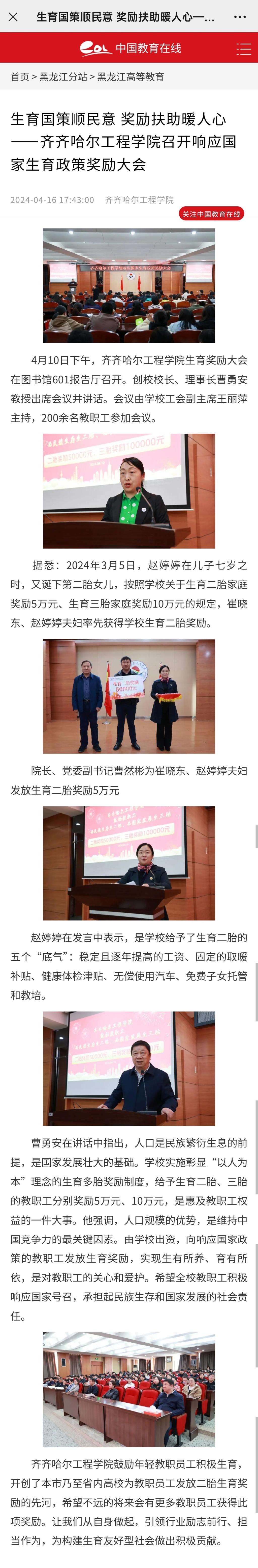 《中国教育在线》报道学校生育国策顺民意 奖励扶助暖人心