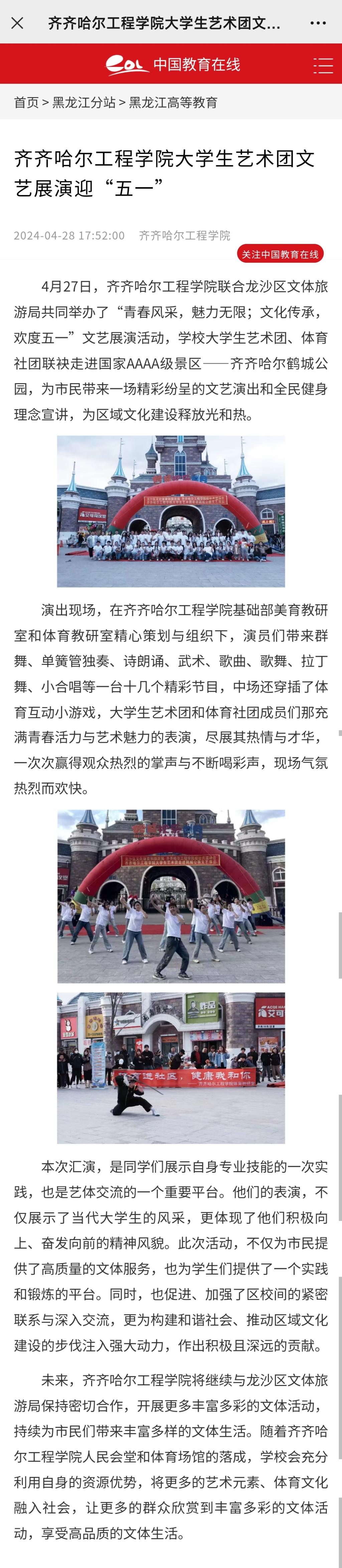 《中国教育在线》报道乐投app官方在线入口大学生艺术团文艺展演迎“五一”