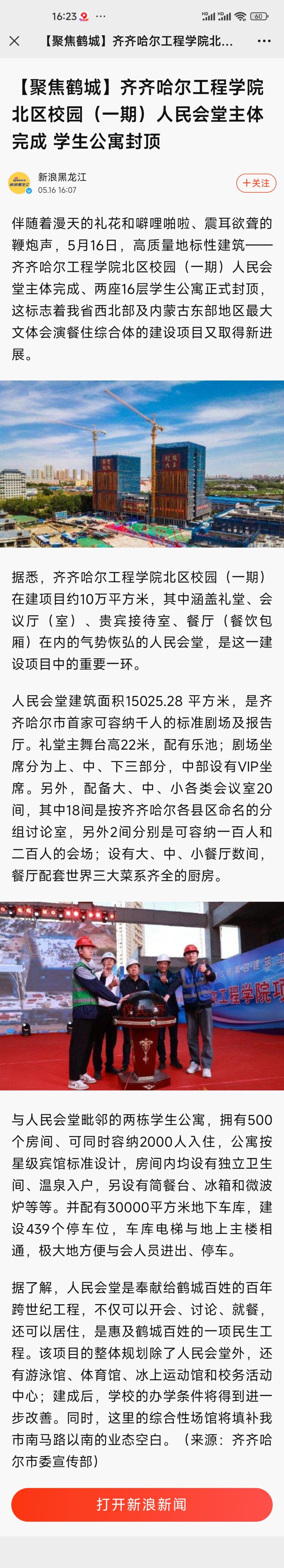 《新浪黑龙江》报道乐投app官方在线入口北区校园要(一期)人民会堂主体完成 学生公寓封顶