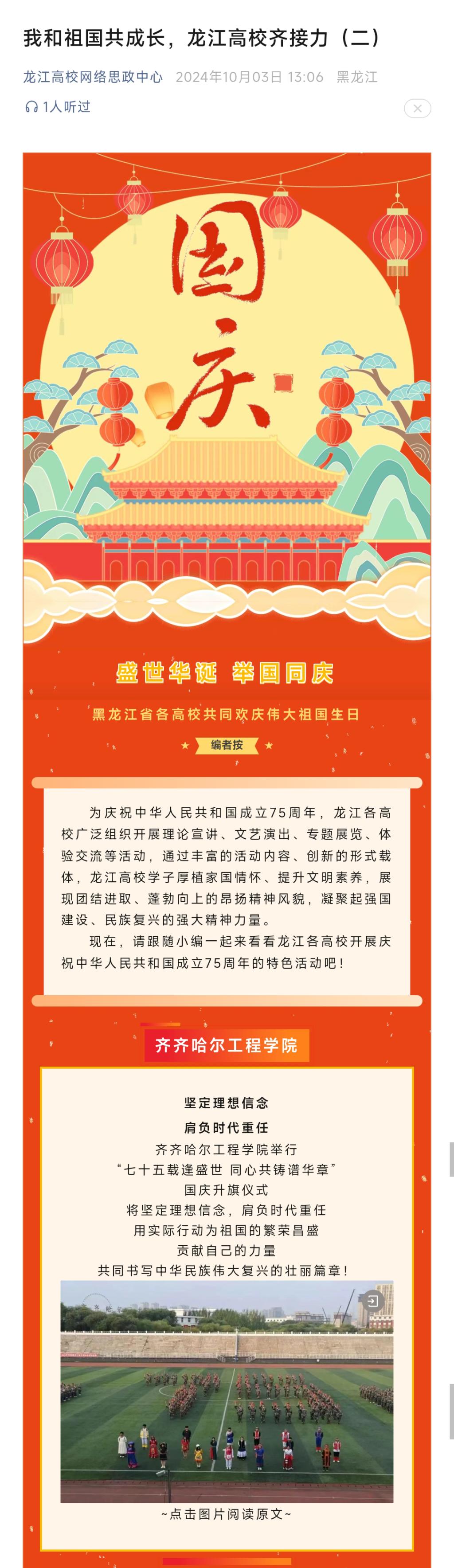 《龙江高校网络思政中心》报道乐投app官方在线入口举行“七十五载逢盛世 同心共铸谱华章”国庆升旗仪式