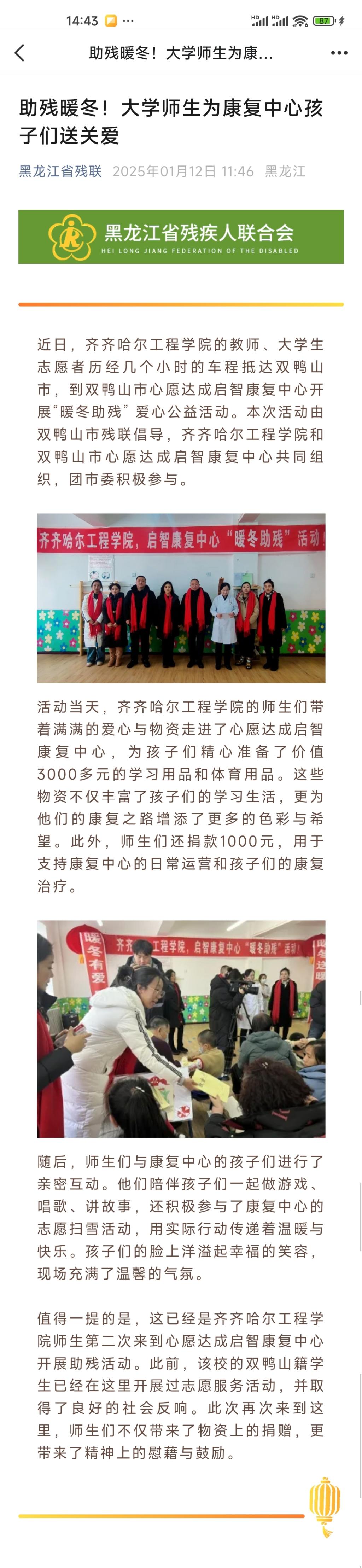 《黑龙江省残联》助残暖冬!大学师生为康复中心孩子们送关爱