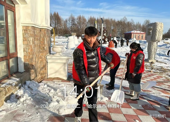 董洋小组:日前,工程管理专业232班学生董洋小组加入哈尔滨市通河县志愿服务队,董洋与队员刘盈盈、常辉一起参加了“宣传龙江旅游文化”志愿服务活动,通过多种形式“表白家乡”,宣传家乡冰雪文化,助力家乡建设。小组成员参加通河县米乐谷亲子园清雪志愿服务,参加了游客接待等服务培训。