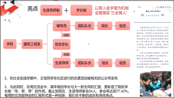 随着2023-2024学年度社会实践学期的深入开展,建筑工程系全体生涯导师继续以认真、严谨的工作态度面对此次指导任务,针对全系学生不同地域和不同特长,以“生涯导师制”+“学长制”的混合模式开展创新社会实践学期指导工作,并安排党员学长以助教身份协助生涯导师工作。日前,各位生涯导师分别通过腾讯会议平台,召开社会实践学期指导交流会。