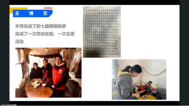生涯导师李俊:为了让学生更好完成社会实践学期,发挥学生们的能动性,李俊老师经常采取召开腾讯会议的方式进行总结和督促。 通过学生汇报的方式,检查大家作业完成的情况,要求同学们合理安排时间,有效推进学习进度,监督同学们更好地完成社会实践学期的学习任务。李俊强调,一些同学通过线上的方式对母校进行回访,或者进行其他活动时,宣传报道要及时,文稿格式要规范,内容表述要准确,稿件质量还需要提高。同时叮嘱同学们一定要注意剩余的活动安排,冰雪之约和志愿服务一定要注意安全。