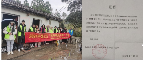 在机电工程系指导教师郭兴宇指导下,汽服专业王云钦小组于近日参加了2024年爱立方“慈善情暖万家”志愿活动,并前往防城港市鲤鱼江村和大王江村,探访了三户困难学生家庭。