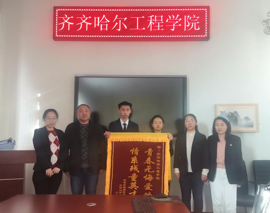 3月5日,双鸭山市心愿达成启智康复中心向学校赠送一面锦旗,表扬计科233班孙博涵、刘展瑞在社会实践学期志愿服务中的优秀表现。